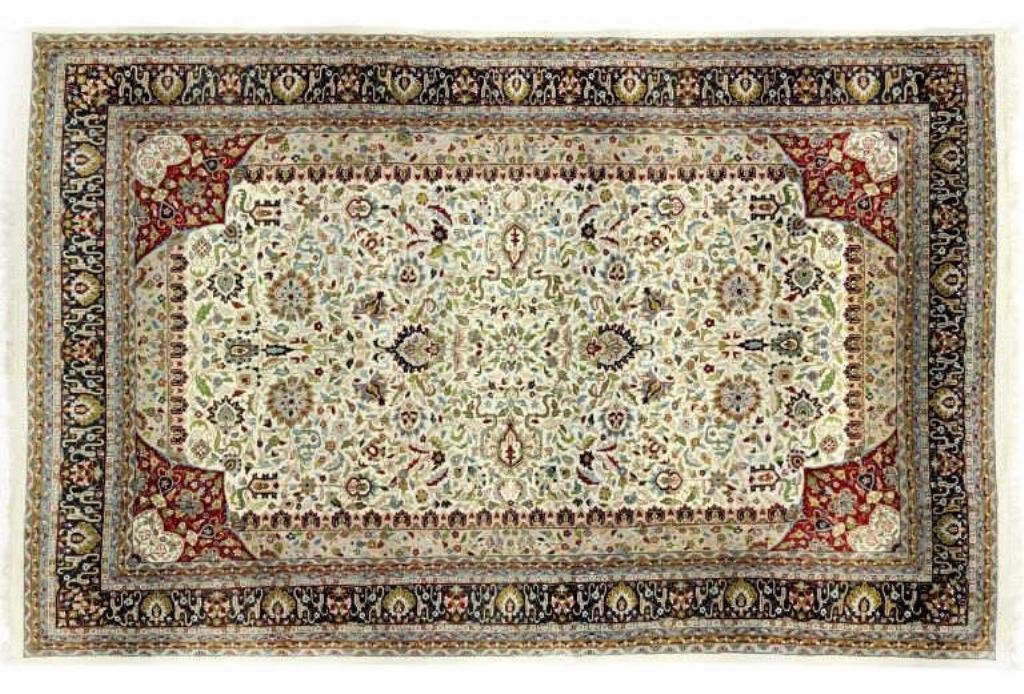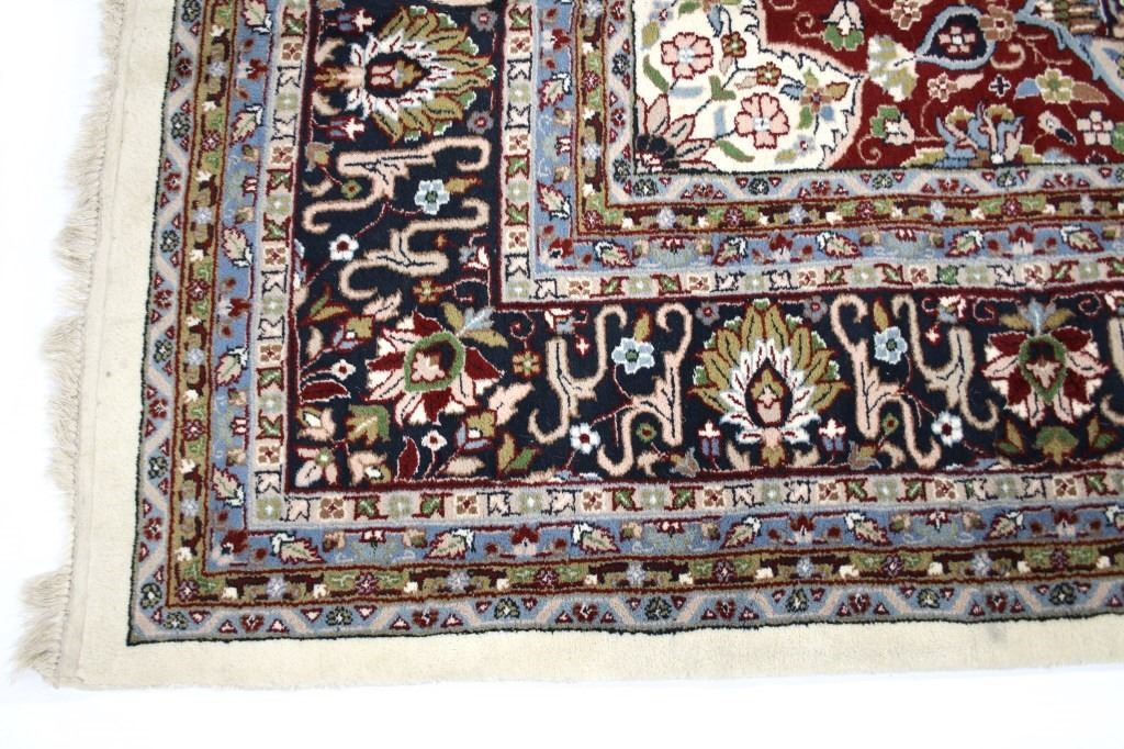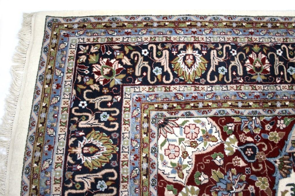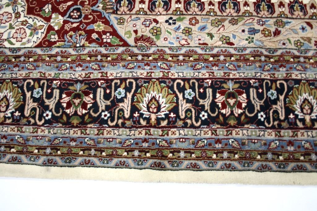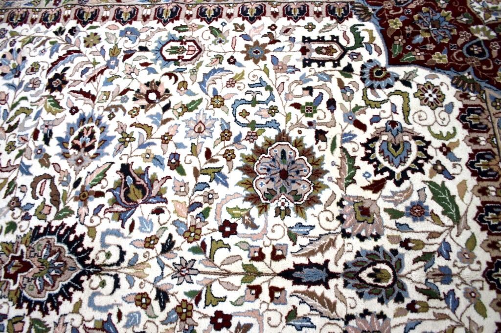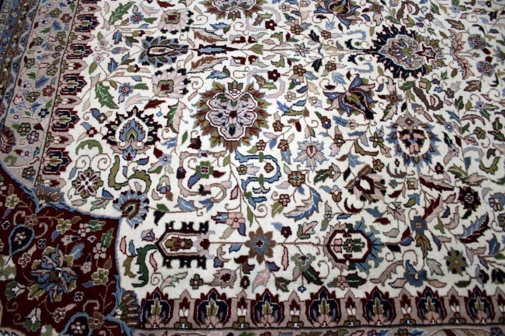 Featured in this lot is this Iranian Persian Kashan pile woven carpet circa 20th century. Very large rug in fine condition. The rug features a wonderfully and professionally crafted 100% wool construction that shows 100% vegetable dye called abrash. The rug features a clean white field with floral decoration of green, maroon, and different shades of blue. The rug features a triple border with geometric patterns and a fringe shown on both sides of the rug. The condition of this large rug is good with no obvious signs of damage and shows good overall condition. The measurements of this large rug are 221" x 143 1/2".