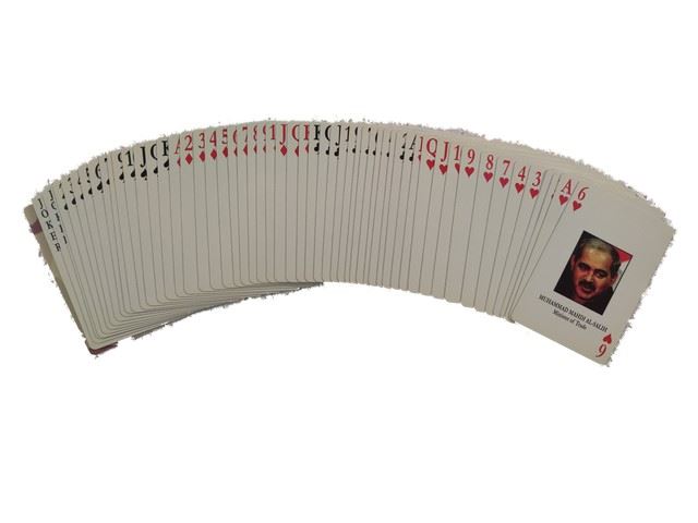 Hoyle Iraq War Most wanted Military Playing Card Decks (3) ca. 2003. Each deck contains cards depicting photos of Saddam Hussein and the Iraqi Military. There are also additional cards containing information about the ranks. (55) (2.5" x 3.5")