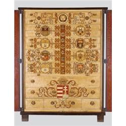 magyar, 1920 körül, tölgyfa borítású két ajtó mögött 27 db fiók, juharfa fióktest, homlokfelületén jávor, mahagóni és diófa intarziával céh jelvények, Kossuth címer és "T. Bodrog Erzsébet" felirattal, 165*128*62 cm