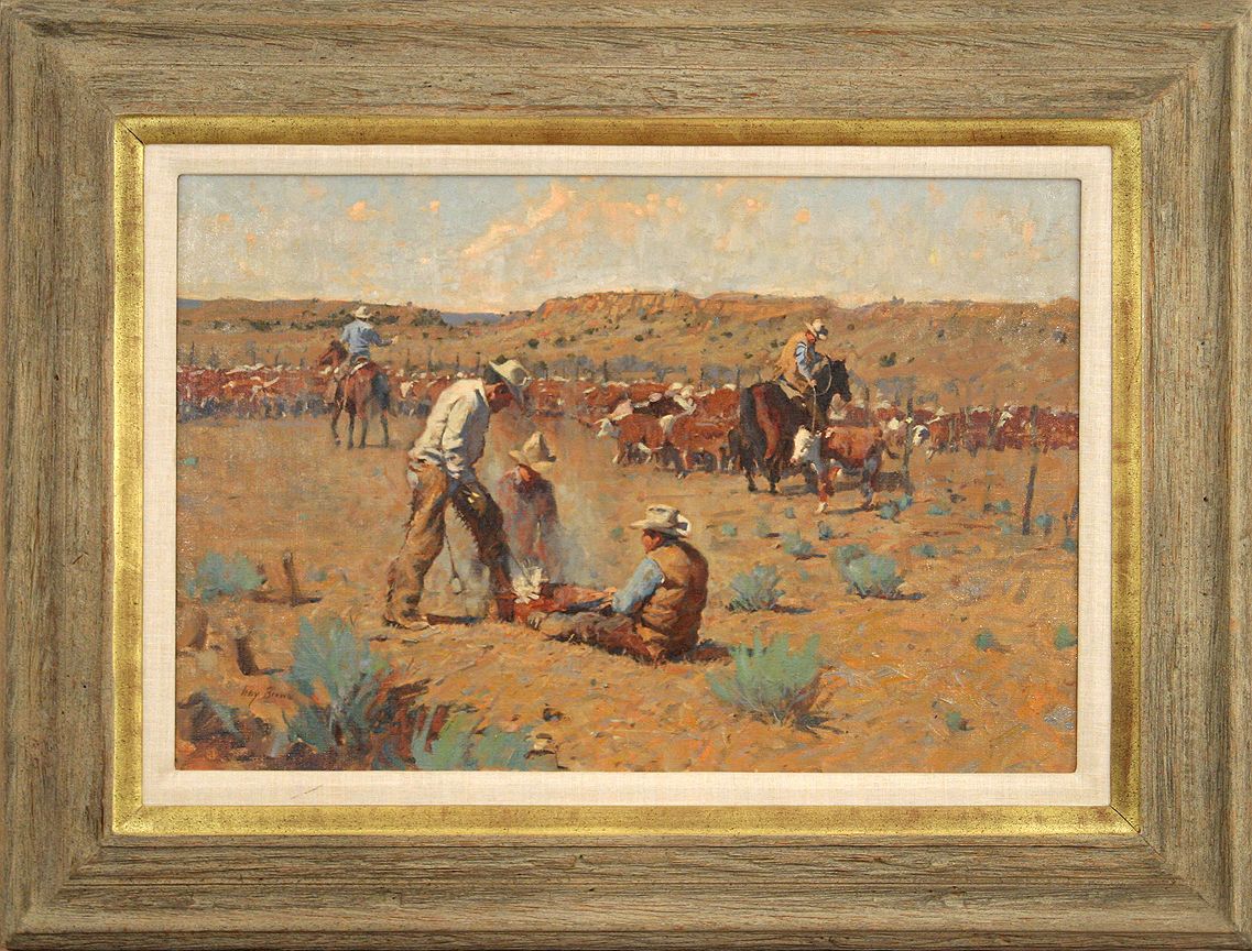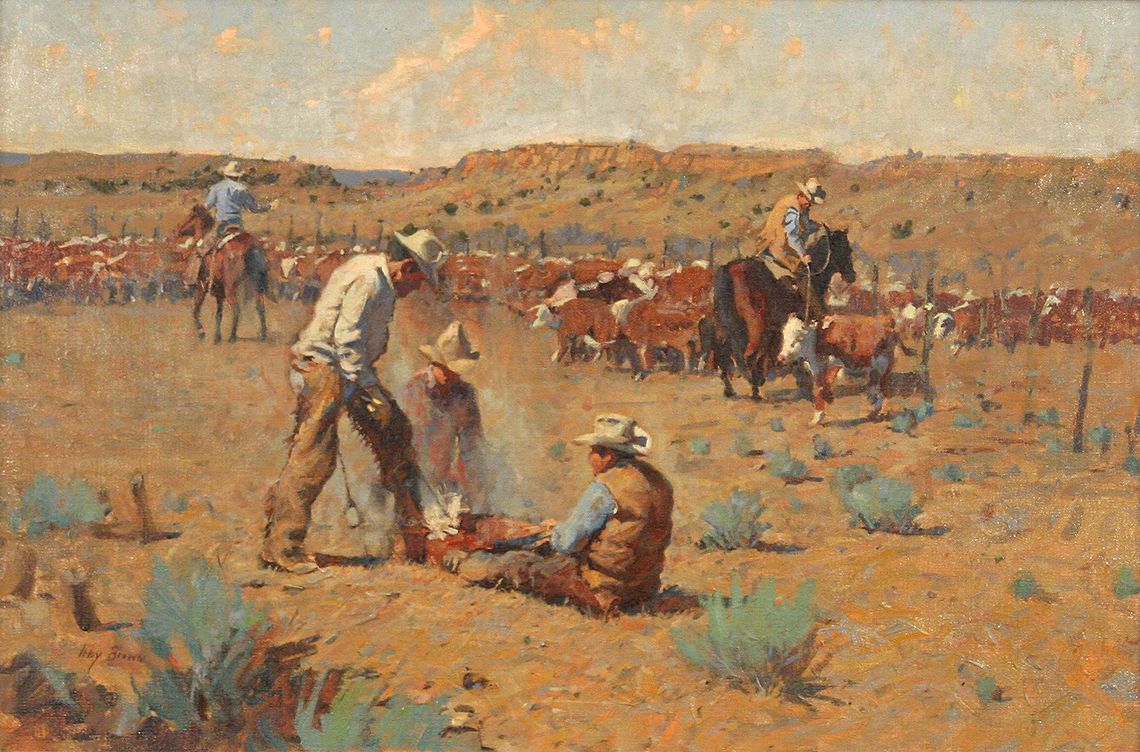 Irby Brown (b. 1928). Branding Day on the Ranch. 20" x 30" oil on canvas. Signed lower left: Irby Brown. (est. $2,000-3,000). CONDITION REPORTS: www.auctioninsantafe.com/docs/cr2012.pdf