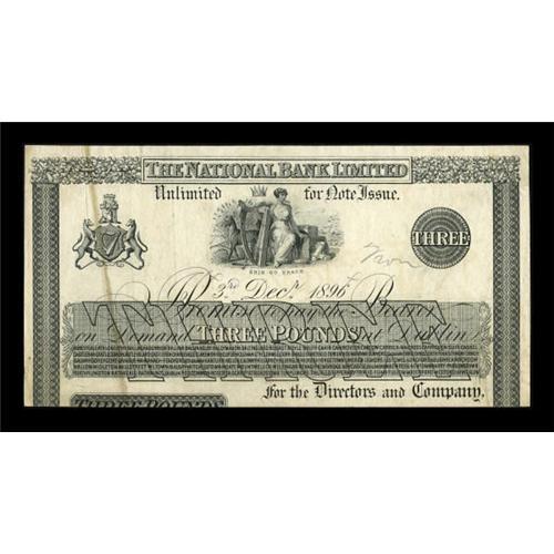 <B>Ireland </B></I>3 Pounds National Bank Limited<B> </B></I>1896 Pick UNL Face Proof<BR> The December 3, 1896 date is not listed in the Krause reference. This face proof was once mounted in an album and the bottom edge is inside the frame line. <B>Extremely Fine-About Uncirculated</B></I>.<BR><BR><b>Shipping:</b> Coins & Currency (<a target="_blank" href="http://www.heritageauctions.com/common/shipping.php">view shipping information</a>)