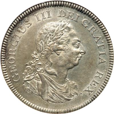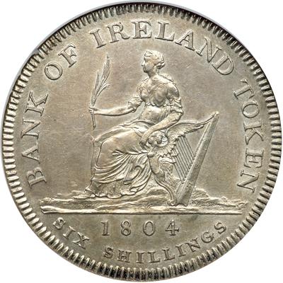 Ireland. Bank Token Six Shillings, 1804. S.6615; Dav-102; KM-Tn1. George III, 1760-1820. Obverse: Draped laureate bust of King. Center leaf points to E. Reverse: Hibernia seated with branch and Irish harp. BANK OF IRELAND TOKEN. Date and SIX SHILLINGS below. NGC graded AU-55.