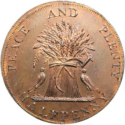 Ireland. Dublin. Halfpenny, ND. D&H-336. Edge: Plain. H.S & Co cypher. Reverse: Wheatsheaf and doves. Scarce. NGC graded MS-65 Red & Brown.