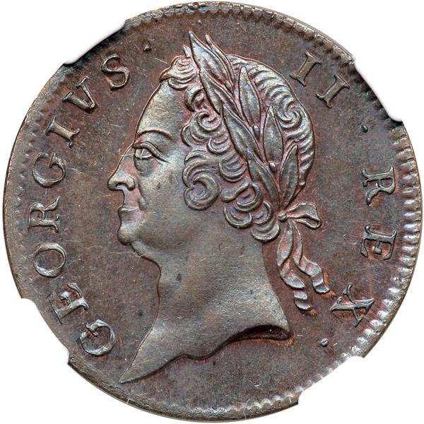 Ireland. Proof Halfpenny, 1760. S. 6610; KM-136. George II, 1727-1760. Old head left. Reverse: Crowned harp. Minor spots. Lovely color with great eye-appeal. NGC graded Proof 65 Brown.