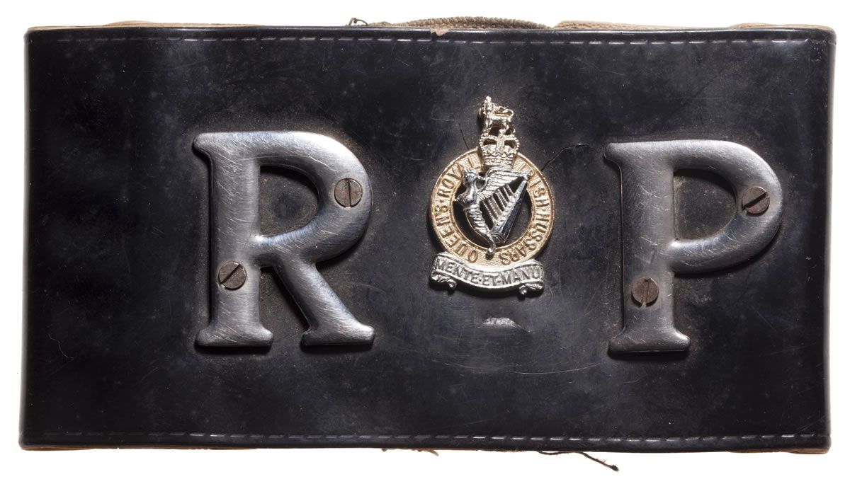 Queen's Royal Irish Hussars, Prison Guard Force, Maze Prison, Belfast, Regimental Police Arm Band, 1983-1988, in polished leatherette, "R.P." screwed on, with staybrite QRIH badge at centre, elastic at back. A scarce original IRA era memorabilia item.
