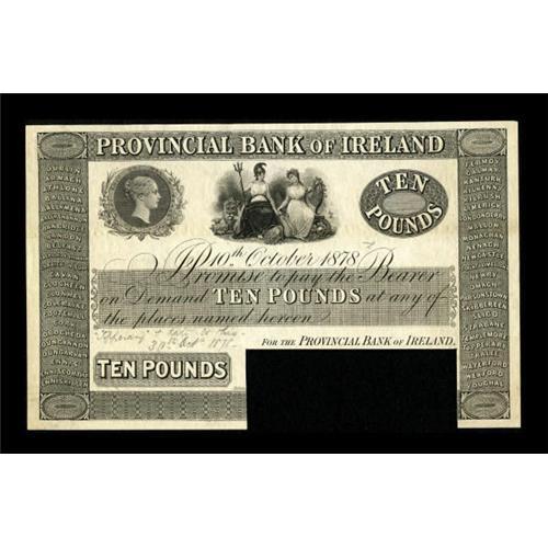 <B>Ireland </B></I>10 Pounds Provincial Bank of Ireland 1878 Pick UNL Face Proof<BR> The Krause reference does not list any notes for this bank between 1874 and 1885. This is a face proof that was once mounted. It has a pencilled notation on the face. The signature block area has been removed from the note. <B>Crisp Uncirculated.</B></I><BR><BR><b>Shipping:</b> Coins & Currency (<a target="_blank" href="http://www.heritageauctions.com/common/shipping.php">view shipping information</a>)