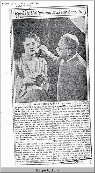Irene Dunne from The Max Factor Collection / (1) 8 x 10 Negative No. 100 of Irene Dunne Posing while Max Factor Uses Make-Up Brush / (1) 8 x 10 Black & White Photograph stamped Master File / (1) Photocopy of July 9, 1933 Sioux City, Iowa Journal Newspaper Article