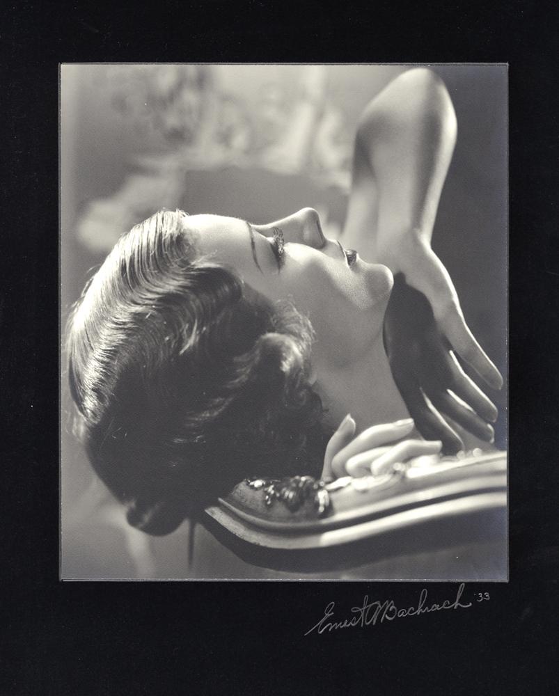 (RKO, 1933) Silver bromide matte borderless 9- ¼ x 10 in. (on 15 x 20 in. 4-ply board mount) exhibition print of Irene Dunne from The Silken Chord by Ernest A. Bachrach; with photographer signature Ernest A. Bachrach `33 in graphite on the mount recto. From the personal collection of the photographer. Excellent.