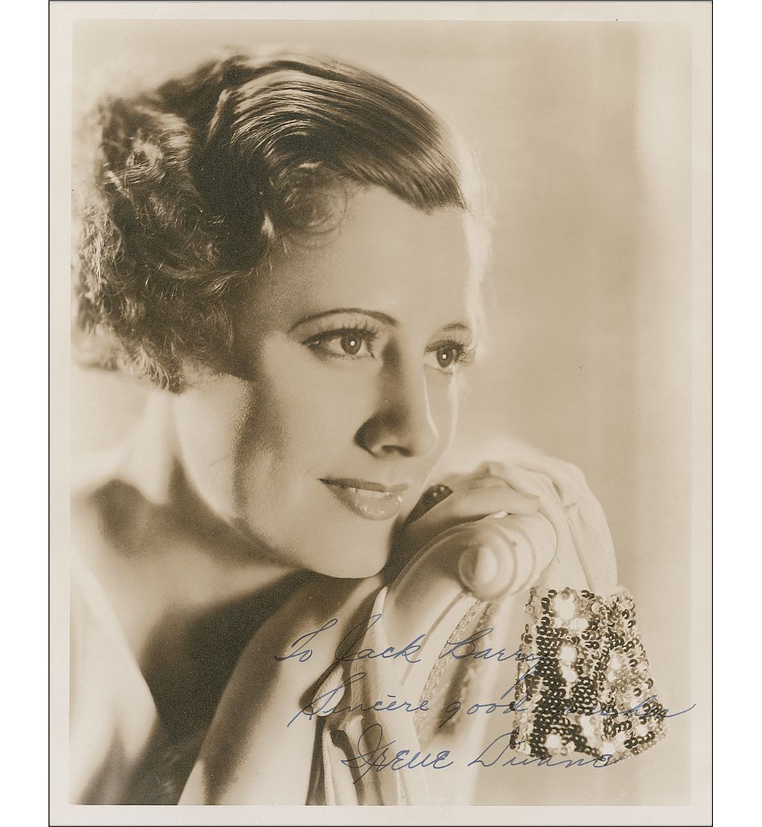 Vintage sepia matte-finish 8 x 10 head-and-shoulders photo, signed and inscribed in fountain pen “To Jack Barry, Sincere good wishes from Irene Dunne.” In fine condition, with a bit of light contrast to portion of inscription, and a bit of trivial silvering.