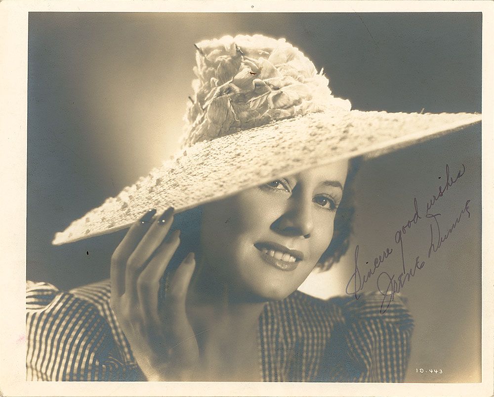 Vintage matte-finish 10 x 8 photo of Dunne peering out from under a large sun hat, signed in fountain pen, “Sincere good wishes, Irene Dunne.” In very good condition, with a tack hole to top edge and moderate silvering to darker portions of image and background.
