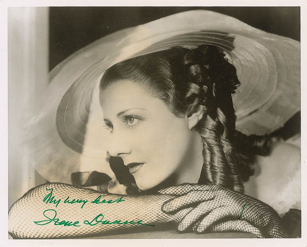 Matte-finish 10 x 8 photo of Dunne in lace gloves and a sun hat, signed in green felt tip, “My very best, Irene Dunne.” Mild rippling, light corner and edge creasing, and a bit of light discoloration to image, otherwise fine condition.