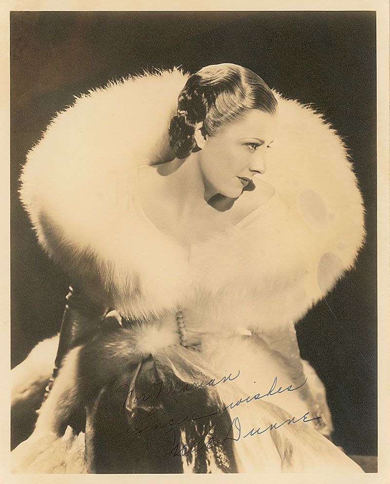 Vintage matte-finish 8 x 10 photo of Dunne in a huge fur-collared robe, signed and inscribed in fountain pen “For Marion, Sincere wishes, Irene Dunne.” Moderate contrast to portions of signature and inscription and a couple fingerprints to right side, otherwise fine condition.