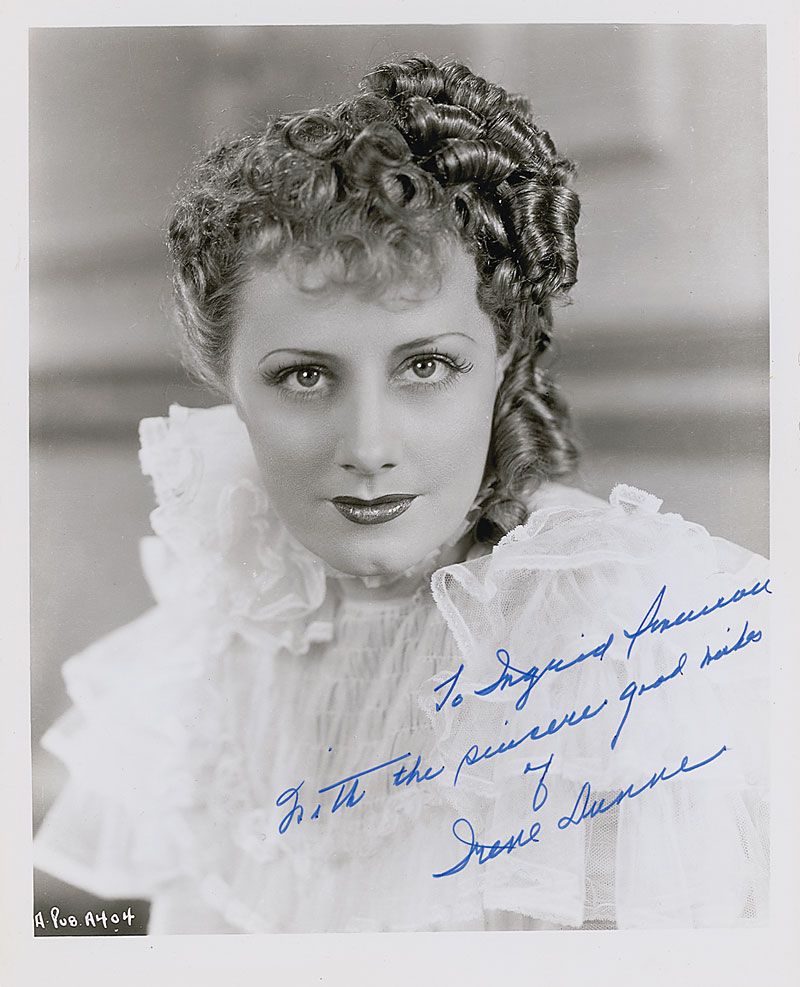 Glossy 8 x 10 photo of Dunne in white lace, signed and inscribed in blue felt tip “To Ingrid Inerman, with the sincere good wishes of Irene Dunne.” In fine condition.