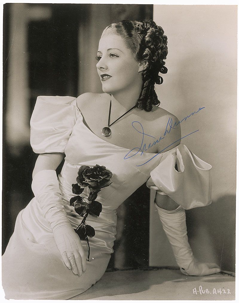 Glossy 6.75 x 8.5 photo of Dunne wearing a wonderful gown and holding a flower, signed in blue ballpoint. Scattered creases and corner tip dings, otherwise fine condition.