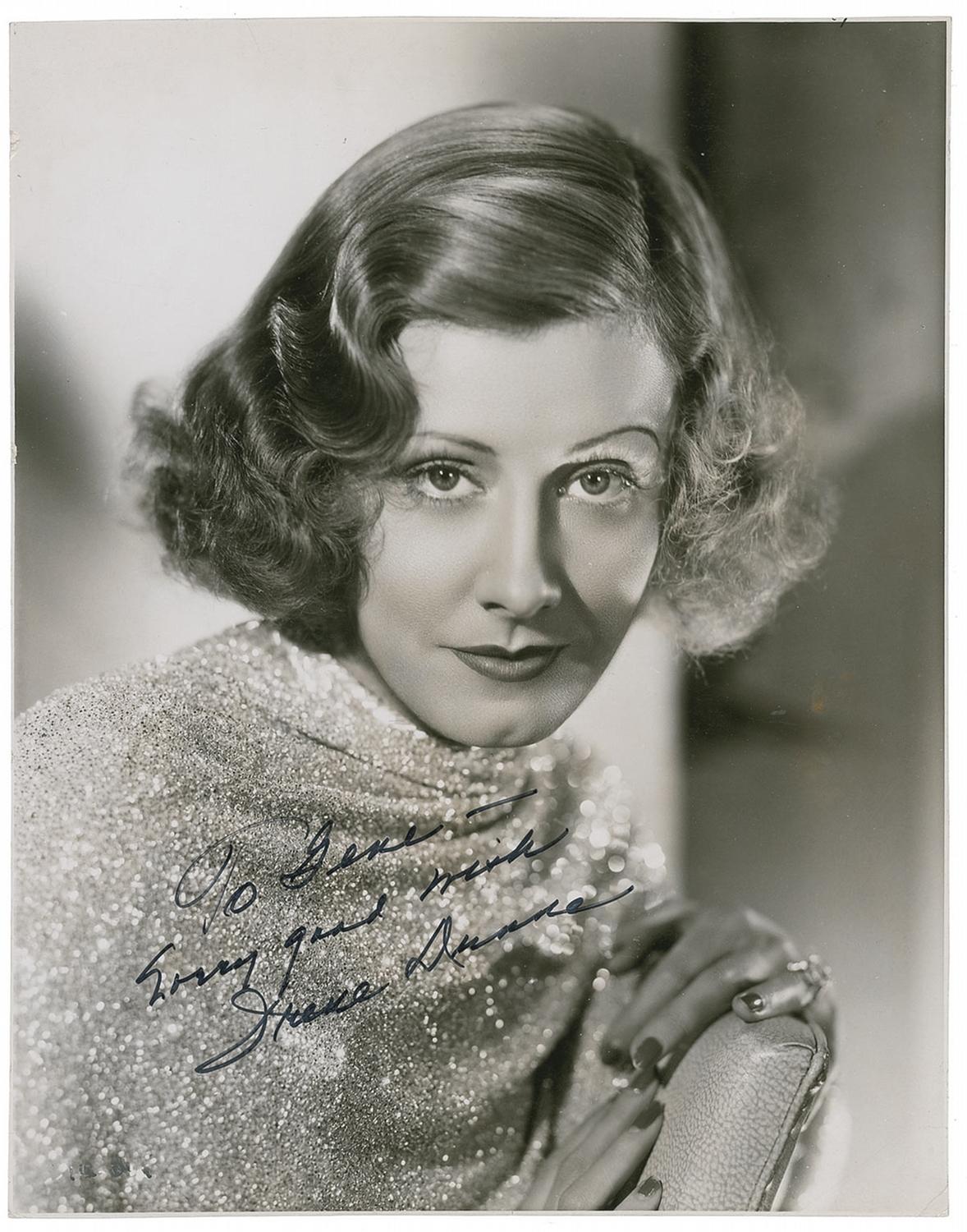 Vintage glossy 10.75 x 13.5 photo, signed and inscribed later in black felt tip “To Gene—Every good wish, Irene Dunn.” A few edge dings, corner creases, and surface marks and spots, otherwise fine condition.