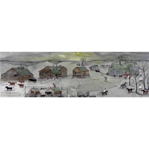 [Canadian 1914-1996] HALLOWEEN CAPERS; 1984 Watercolour and ink on paper 6.75 x 21.25 in. Signed, titled & dated.