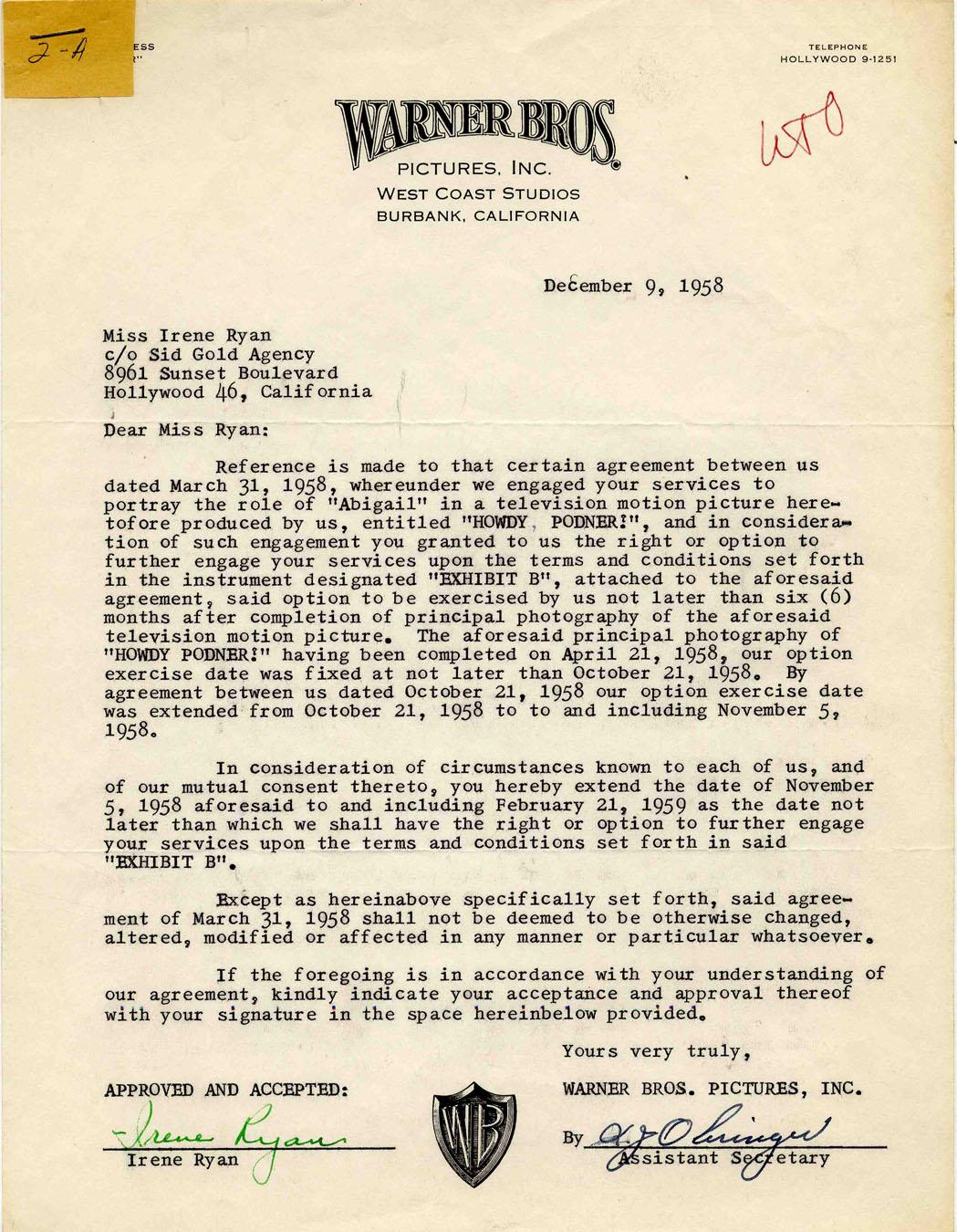 Scarce contact signed by ''Beverly Hillbillies'' television icon Irene Ryan. Signed on ''Warner Bros. Pictures, Inc.'' stationery and dated 9 December 1958 from Burbank California. Single-page agreement was made for Ryan's ''…services to portray the role of 'Abigail' in a television motion picture heretofore produced by us, entitled 'Howdy Podner!'…'' Boldly signed ''Irene Ryan'' and countersigned by a Warner Bros. executive. Letter on one page measures 8.5'' x 11'', with stapled note on top left corner reading, ''2-A''. Overall near fine.