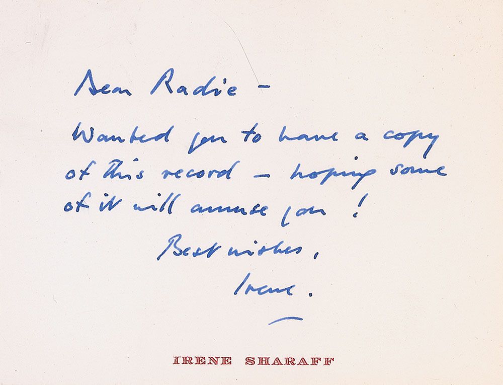 Costume designer who won five Academy Awards (1910–1993). ANS signed “Irene,” one page, 4.5 x 3.5, personal letterhead, no date. Note to journalist Radie Harris. In full: “Wanted you to have a copy of this record—hoping some of it will amuse you!” In fine condition.