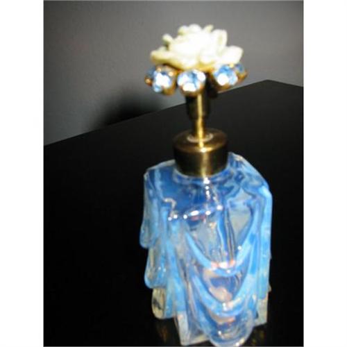 This gorgeous 4.5 inch perfume bottle is from France. It is labeled and has engraving on the bottle on the base. This bottle is ornate and decorated with Blue Rhinestone sitting on a flower with golden metal cap. It is an atomizer and spray works. It opens and in excellent condition. The color of the bottle is soft blue with decoration on the glass. It is a lovely bottle.