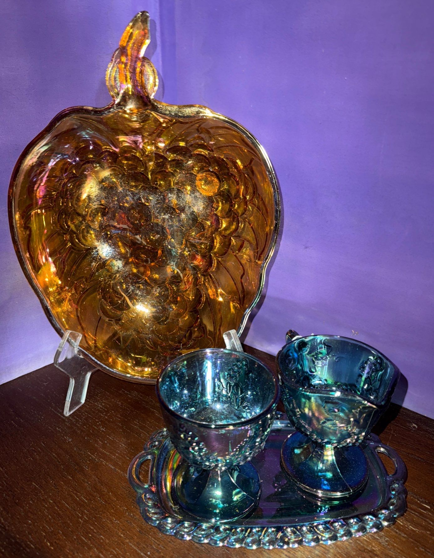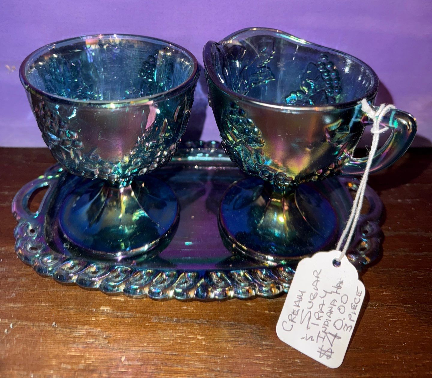 Iridescent Indiana Carnival Glass Tableware- Serving Bowl & Cream+Sugar w/Tray