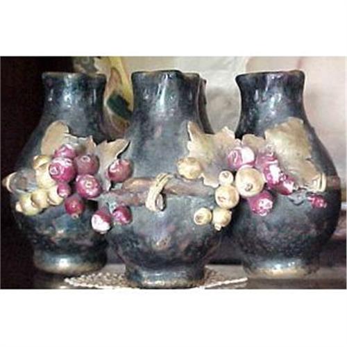 This is a unique Austrian amphora vase that consists of four small vases attached to each other by applied vines. The vines have applied berries and smaller stems. The basic color is iridescent blue with hints of pink and gold. The berries are yellow and red. There is the usual damage to the stems as shown in the photo and one factory tear shaped slip in the finish. It is still a charming decorative and useful object of art.
