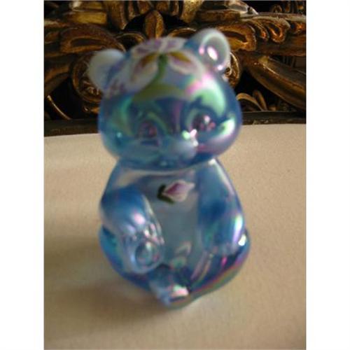 lovely teddy bear is blue shimmered (irridscent) and hand painted with signature of the artist "Hand paint by J. Watson" with writing with white paint, on the base and measures 3.5 " T. this magnificent art work is in excellent condition. it also has a mark on his very end on his back (a wide or oval circle) carved with some sort of signature of the artist which i am unable to verify . or is mark of a manufacturer " the mark is similar to Fenton", but i am uncertain. something to think about!