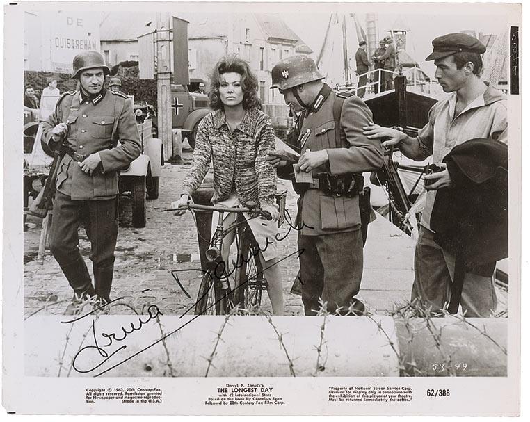 French actress (1936–2004) who had a brief career in American films and was the one-time lover of Darryl F. Zanuck, which resulted in her being cast in The Longest Day. Glossy 10 x 8 20th Century Fox promotional photo for The Longest Day, signed in black ink. Scattered edge and corner tip creases, surface marks, and light rubbing to finish, otherwise fine condition.