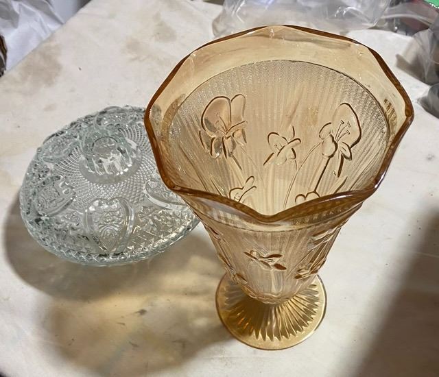 Iris & Herringbone Vase with Glass Cover Dish - Depression
