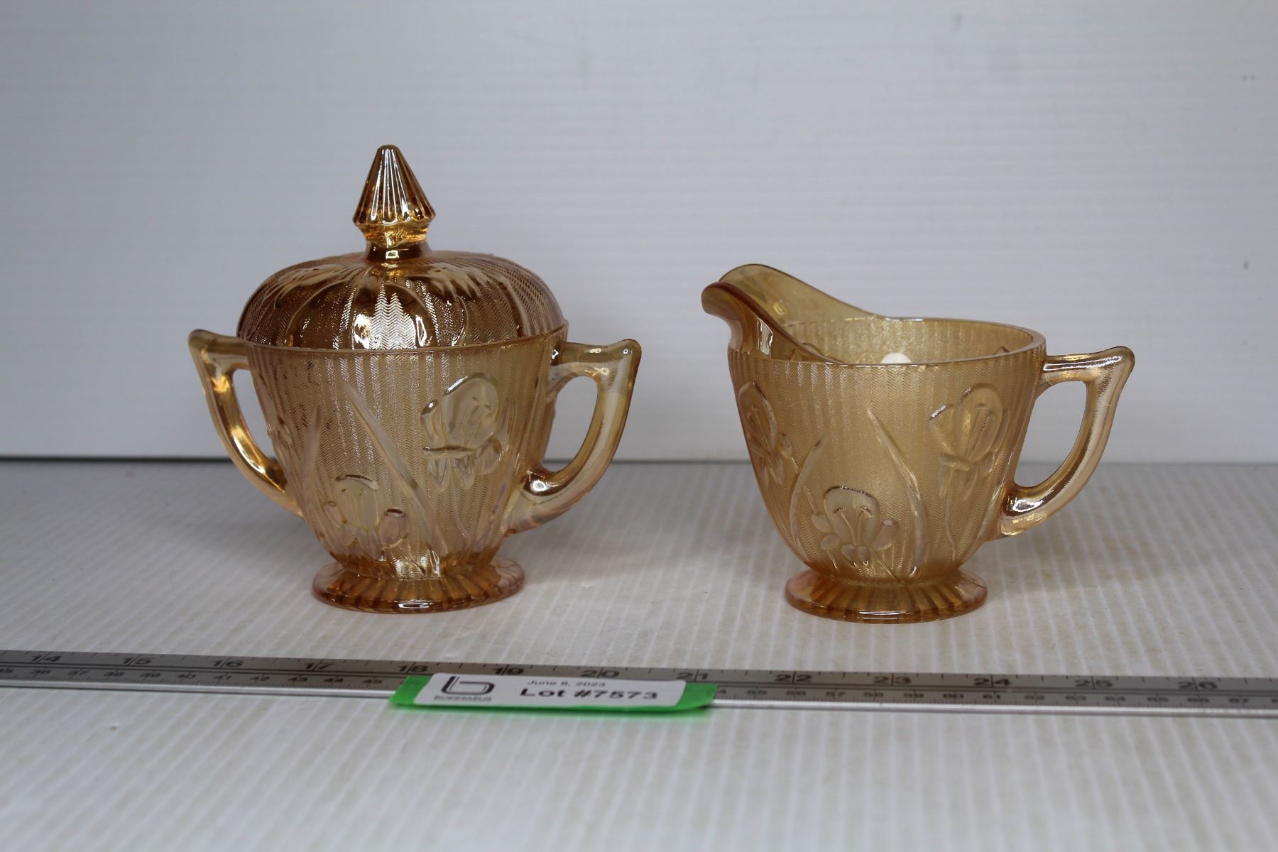 Iris and Herring Bone Depression Glass Cream and Sugar Set