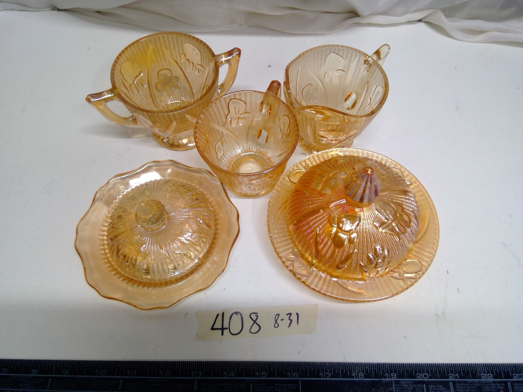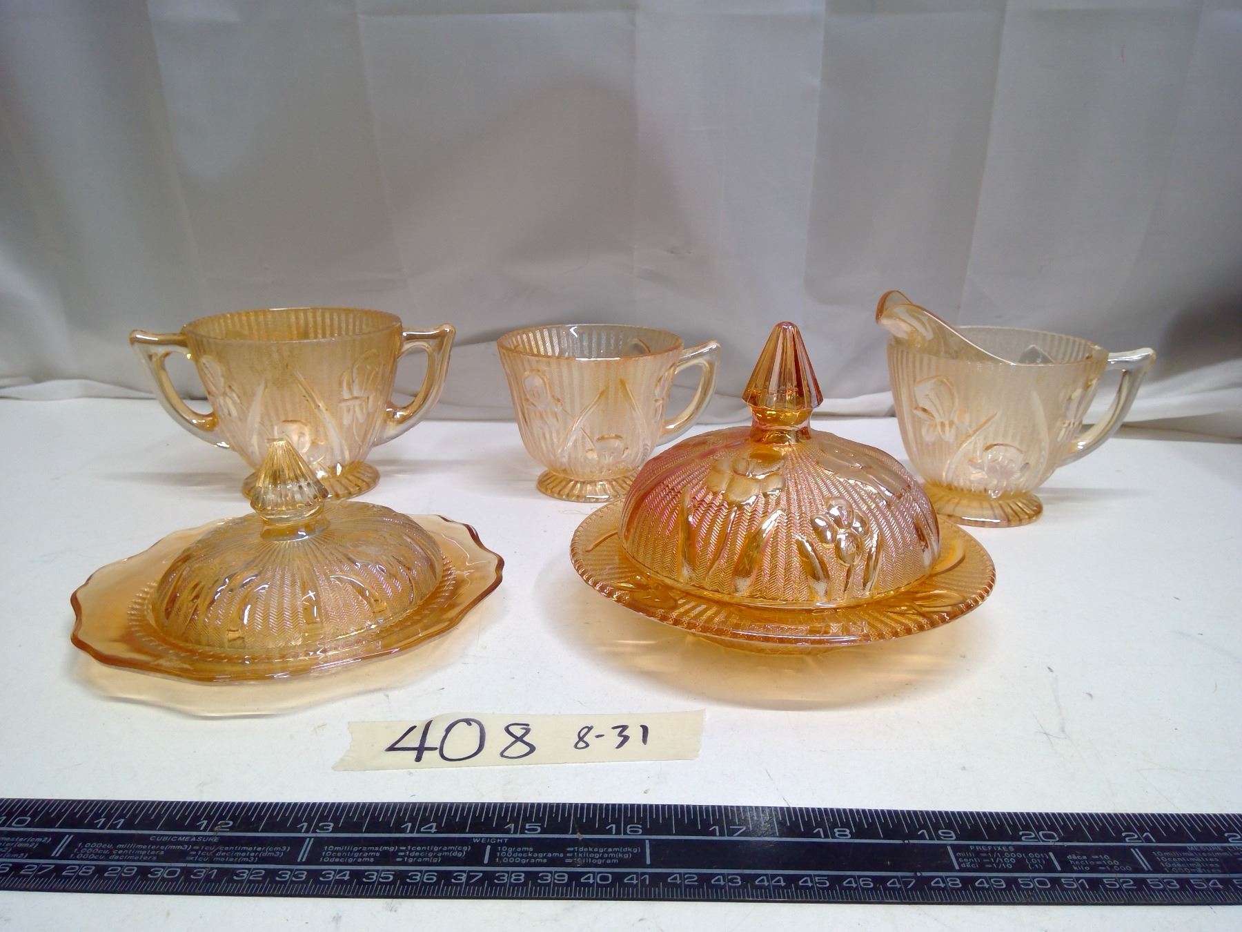 Iris and Herringbone cream and sugar, butter dish, lids- C&S