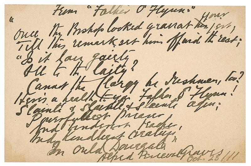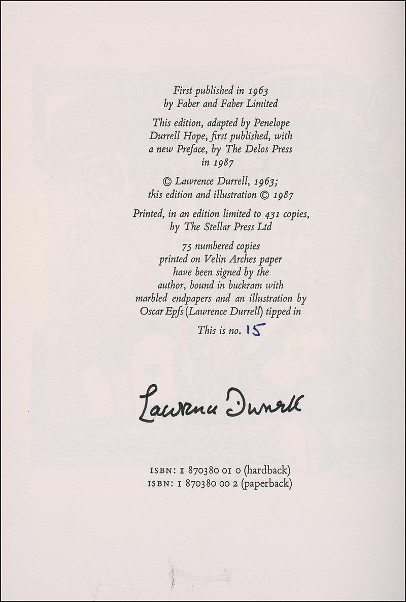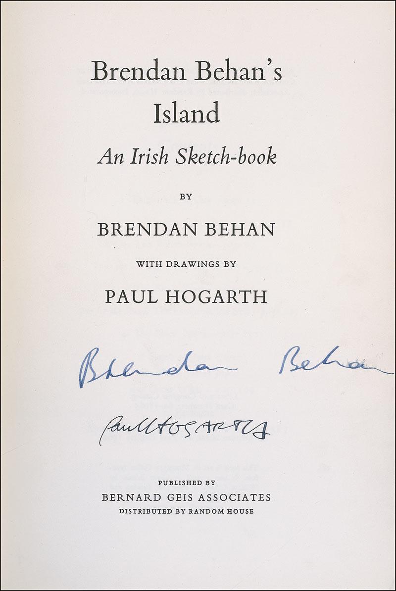 Four items: An AQS, signed “Albert Perceval Graves,” on an off-white 4.5 x 3 card. Graves pens 12 bars from his famous ballad Father O’Flynn, signed at the conclusion and dated October 23, 1911; a signed hardcover first edition of Brendan Behan’s Island, signed in fountain pen on the title page by Brendan Behan and illustrator Paul Hogarth; and two hardcover books, a limited edition of An Irish Faustus, signed by Lawrence Durrell, as well as an unsigned first edition of Clea. In fine overall condition. RRAuction COA.