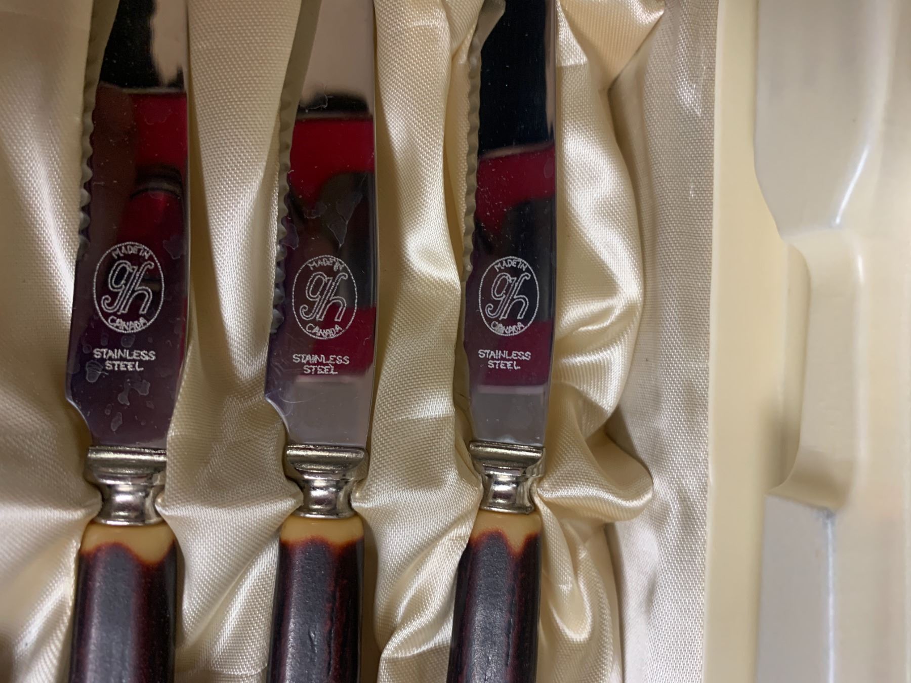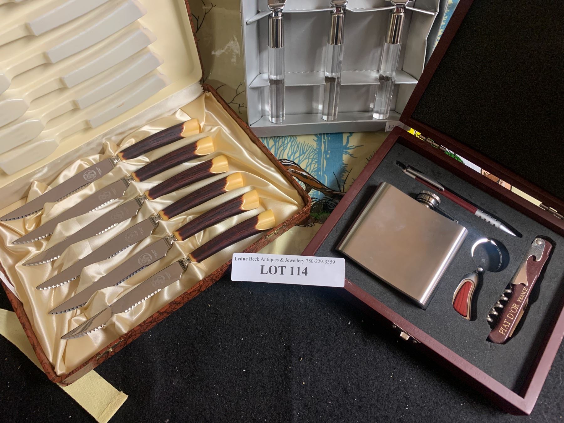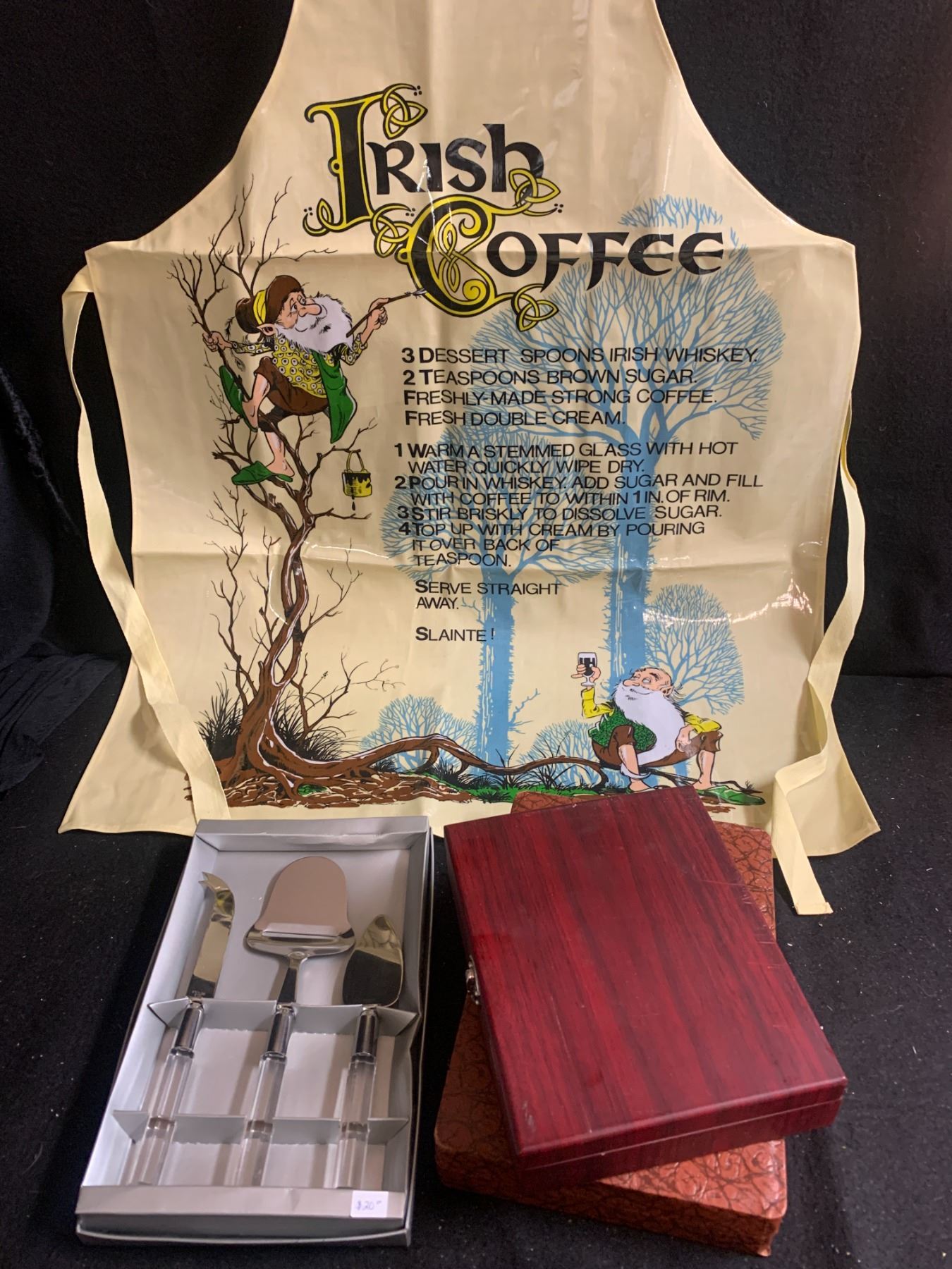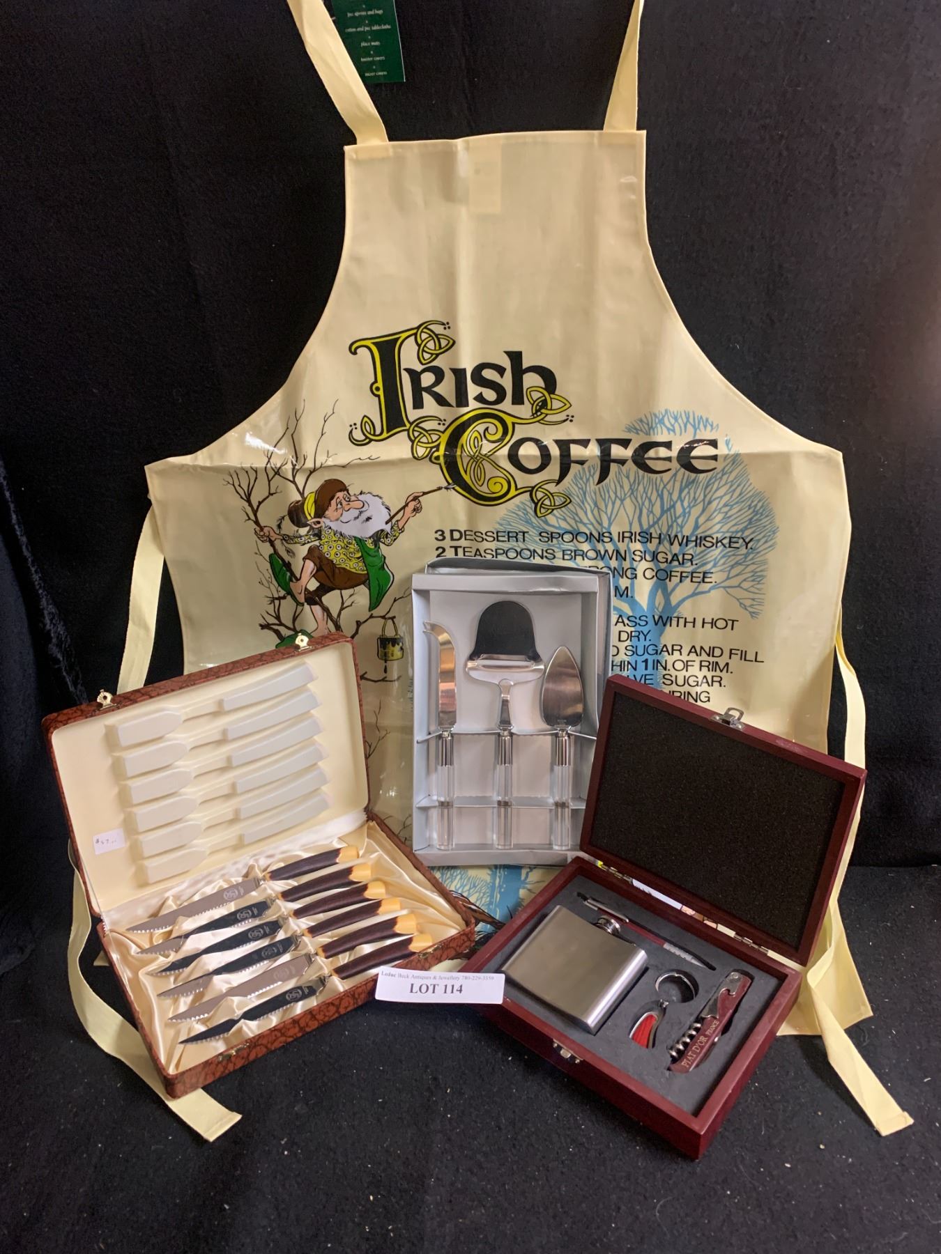 Irish Coffee Apron, Stainless Steel Bone Handle Knife Set, Cheese Serving Set & Flask, Pen Boxed Set