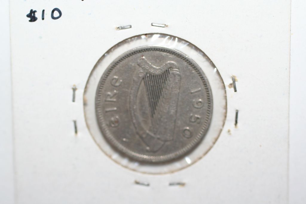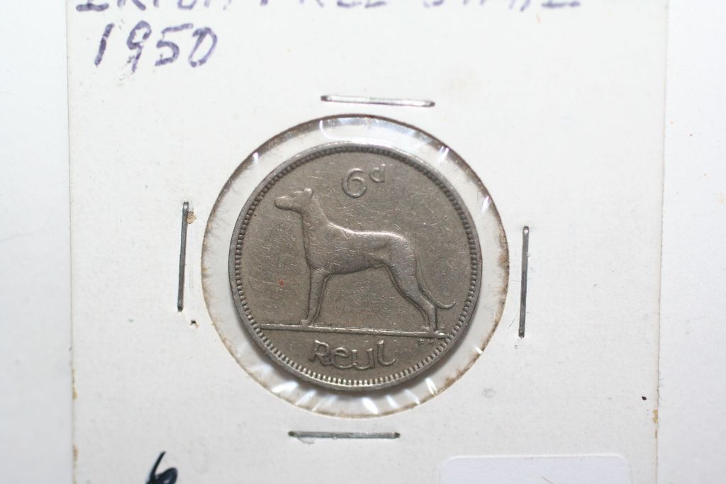 This lot is a 1950 irish free state 6 pence dog coin