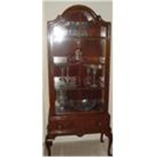This is a Gorgeous Georgian style Burl wood Irish display cabinet circa 1890's from Wright Hunter LTD House Furniture?s in Belfast. The display has three glass shelves and a drawer. The display is on 4 Queen Anne style legs