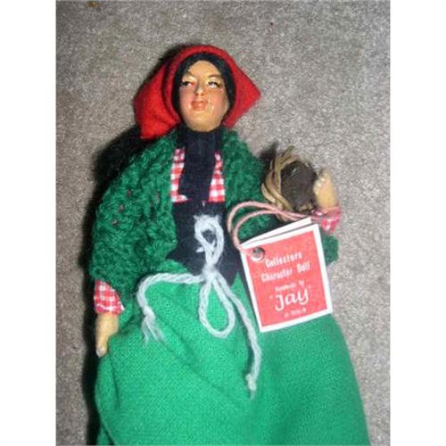 This doll is 7 1/2" tall and is all original. She has her tag on the skirt and a hang paper tag. The tag says Collectors Characters Doll Handmade by Jay of Dublin. The head is a pottery matreial and the body is bendable and made of felt. She is an Irish Colleen with turf basket. A distinctive feature of the Irish Colleen is her two skirts. One is green and the underskirt is red and she has a white lace trimmed slip. She has matching white pantaloons. What a great doll from Ireland. She is from a smoke free environment. If you can enjoy her, please bid. Buyer to pay $10 for U.S. shipping, insurance, and handling. Thanks for viewing.