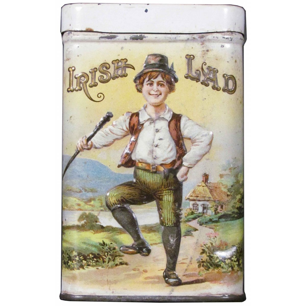 Irish Lad Embossed Cigars Tin for 25 Cigars. Display side very good condition with some paint loss and minor discoloration on back and sides. 3 inches square X 5 inches tall.