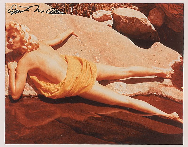 Two glossy photos: an 8 x 10 of the actress in a corset and fur and a color 10 x 8 of McCalla lying on a river bank barely concealed in a towel, each signed in black felt tip. In fine condition.