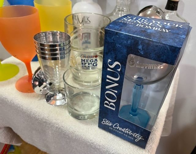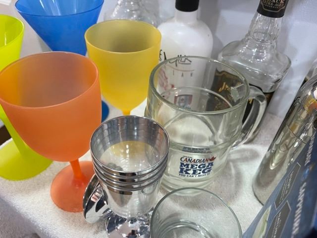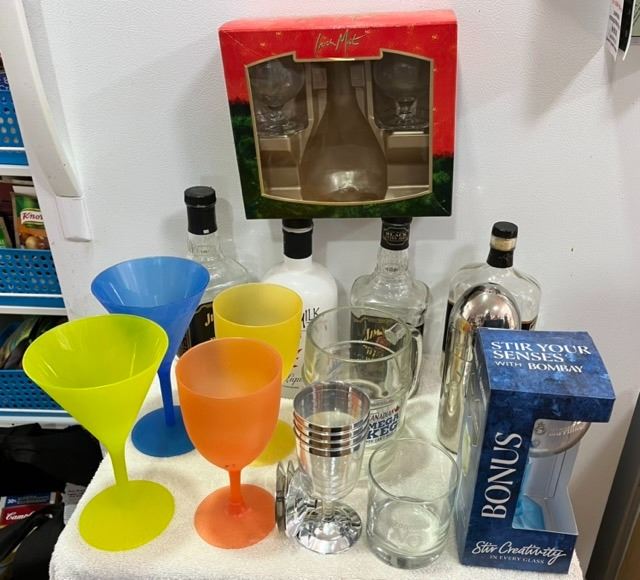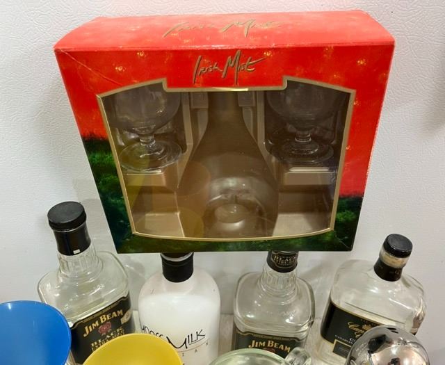 Irish Mist, Jim Beam, Bombay, Canadian Club, Mega Keg, Moose Milk Bottles and Glasses
