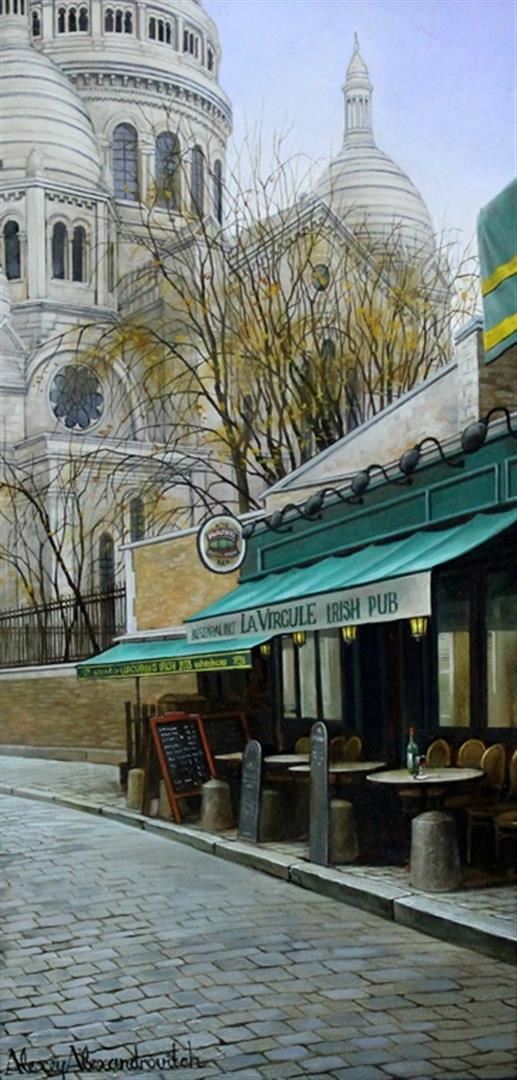 Irish Pub by Alexey Alexandrovitch shows off the outside of the Pub with blue accents and empty tables. Framed original oil on linen measuring at 29 3/4" x 19 7/8".