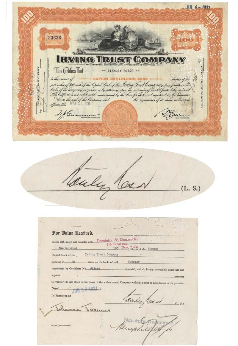 1931, New York. Stock certificate for 100 shares. Orange/Black. Vignette of seated female next to state seal flanked by transportation scenes in background. Issued to and signed on accompanying stock power by Stanley Resor (1879 - 1962) Advertising pioneer. Transformed J. Walter Thompson Advertising Agency into an all-around brand advertising firm. Light soiling and two vertical folds. Fine. Perf cancellations not affecting Resor's signature.