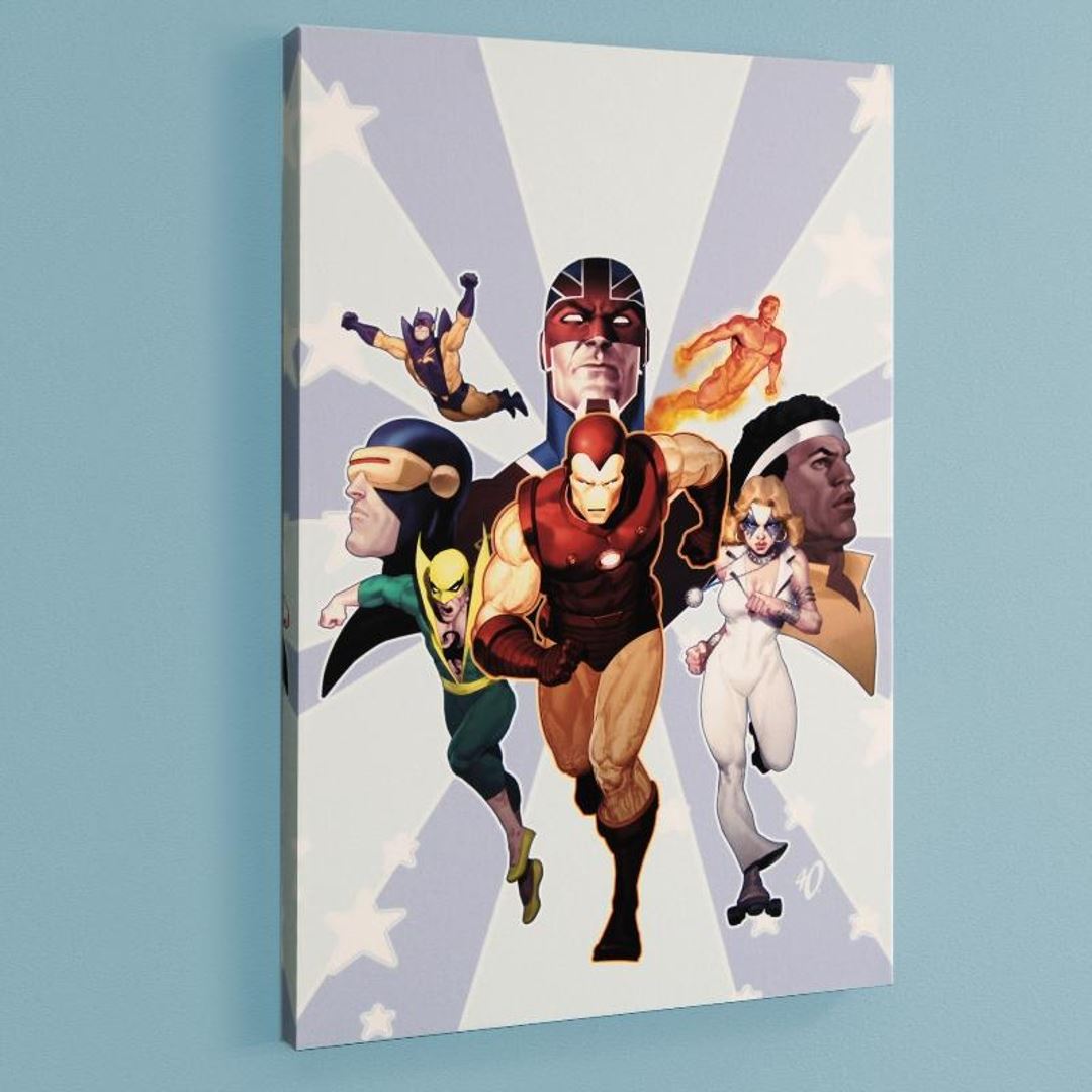 A piece of comic book history, this limited edition print, created by Ariel Olivetti, depicts Iron Man, Iron Fist, Dazzler, Cyclops, Captain Britain, Yellow Jacket and Human Torch. Ariel Olivetti's first work with Marvel was The Last Avengers Story in 1995. Since then, Olivetti has done work for Iron Man, X-Men, and Thor, among others. "Iron Age: Omega #1" is a limited edition numbered giclee on stretched canvas by Ariel Olivetti presented by Marvel Comics. This piece is gallery wrapped and ready to hang. Includes Certificate of Authenticity! Measure approx. 18" x 27" (image); 1.5" (depth).