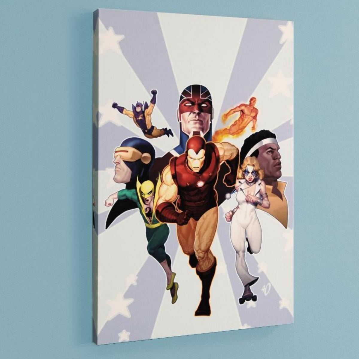 A piece of comic book history, this limited edition, from original art by Ariel Olivetti, depicts Iron Man, Iron Fist, Luke Cage, Dazzler, Cyclops, Captain Britain, Yellow Jacket and Human Torch. Ariel Olivetti's first work with Marvel was The Last Avengers Story in 1995. Since then, Olivetti has done work for Iron Man, X-Men, and Thor, among others. "Iron Age: Omega #1" is a limited edition numbered giclee on stretched canvas by Ariel Olivetti presented by Marvel Comics. This piece comes gallery wrapped. Includes Certificate of Authenticity! Measure approx. 18" x 27" (image); 1.5" (depth).