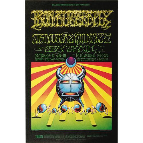 <B>Iron Butterfly/Sir Douglas Quintet Fillmore West Auditorium Concert Poster, BG-141 (Bill Graham, 1968).</B></I> <I>Zap Comix</B></I> buddies Rick Griffin and Victor Moscoso teamed to create this classic image, one of the most popular of the entire Bill Graham Presents series. Surprisingly enough, the poster was only printed once, and its Hopi Furnace image was designed to match BG-140's Dancing Beetle, also by Griffin and Moscoso. The poster measures approximately 14" x 21.25", and is in NM- condition. Very cool!<BR><BR><b>Shipping:</b> Flat Material, Small (<a target="_blank" href="http://www.heritageauctions.com/common/shipping.php">view shipping information</a>)
