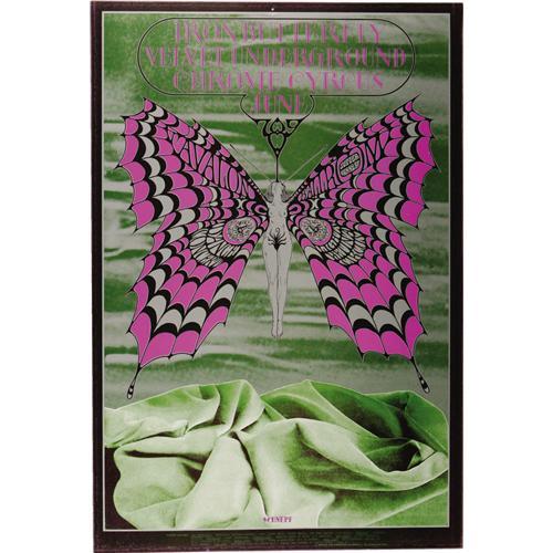 <B>Iron Butterfly/Velvet Underground Avalon Ballroom Concert Poster FD122 (Family Dog, 1968)</B></I> A Bob Schnepf design of a lovely nude with butterfly wings and a most unusual tongue dominates this one-printing poster, done on a metallic, silver-coated stock. The color scheme of purple, green, and black is quite striking and attractive. The poster measures approximately 13.5" x 20, and is in NM- condition.<BR><BR><b>Shipping:</b> Flat Material, Large (<a target="_blank" href="http://www.heritageauctions.com/common/shipping.php">view shipping information</a>)
