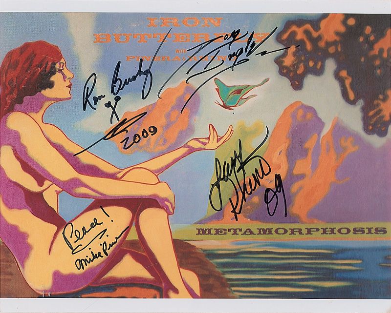 Two items: Color glossy 10 x 8 photo of their Metamorphosis album cover, signed in black felt tip by Doug Ingle, Ron Bushy, Mike Pinera, and Larry Rhino; and souvenir printed lyrics to the opening of ‘In-a-gadda-da-vida’ on an off-white 8.5 x 11 sheet, signed at the top in black felt tip by Don Ingle. In fine condition.