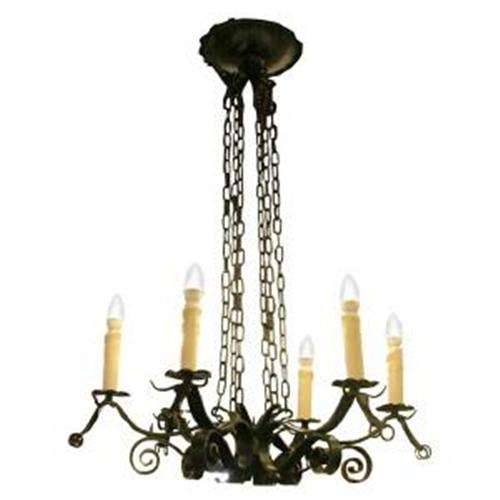 Wonderful restored iron chandelier. Six bulls with ring leads through their noses, scrolled iron work, and original ceiling cap.