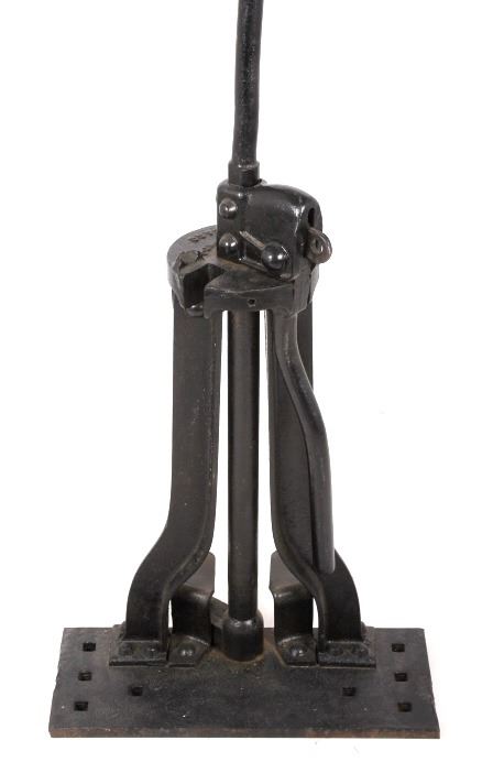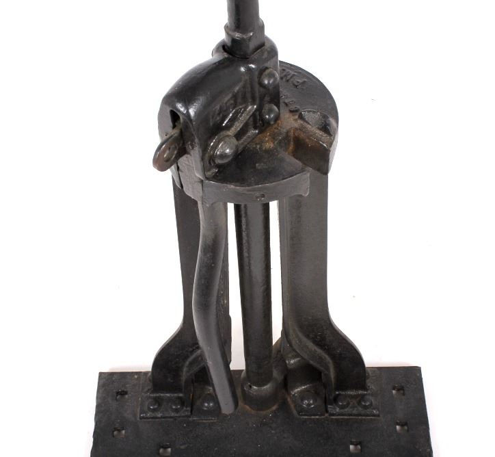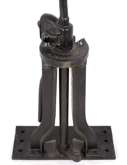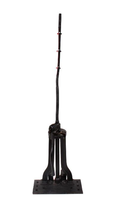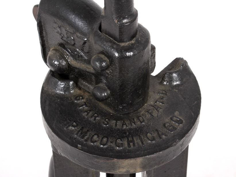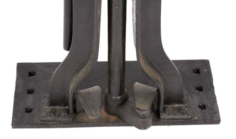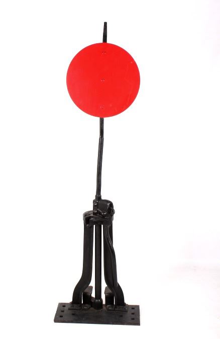 Offered in this lot we have a iron Chicago railroad switch stand. A railroad switch is the section where the tracks split in to two separate tracks. The stand was used to change the direction of the rail switch, and also acts as the indicator of the direction that the track currently going. The switch stand is constructed out of iron with a leaver used to lock in to one of the two sides. The stand is marked across the top of the shift plate, reading "Star Stand Pat-D - PM. CO- Chicago - 457". The piece is in good condition and was recently refinished. It measures 75" tall by 22" wide by 11" deep with the sign measuring 17 3/4" in diameter.