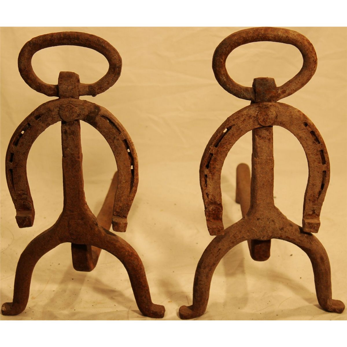 Terrific set of handmade western andirons made from horseshoes to look like bow-legged cowboys. They have a great look and lots of character.