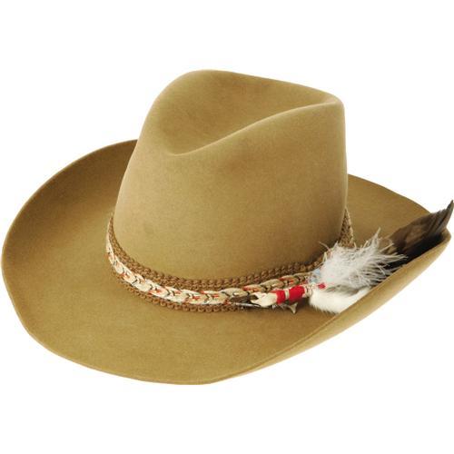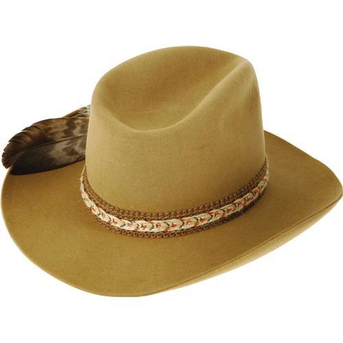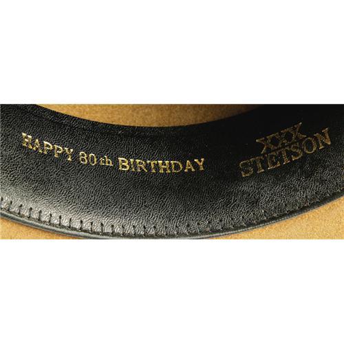 <B>Iron Eyes Cody 3X Stetson, Tailored by "Nudie".</B></I> This is a handsome collaboration between Stetson and "Nudie" Cohn, the legendary designer of western attire, created for the legendary portrayer of the American Indian, Iron Eyes Cody, in honor of his 80th birthday. The hat is dark tan in color, with a splendid weaved band, a large resplendent feather (with some turquoise stones attached) and even two small charms of fish hooked to the band. The inside band reads "Happy 80th Birthday, "XXX Stetson," and "Made by Stetson especially for Iron Eyes Cody," and also features Nudie's engraved trademark. The "John B. Stetson Company 3X Beaver" trademark is engraved on the inside band as well. A wonderfully impressive hat, with connections to Stetson, "Nudie," and the famed "Crying Indian" of the "Keep America Beautiful" commercials. Comes in a the original Stetson box with the color trademark painting on the top. This is a beauty! Excellent condition.<BR><BR><b>Shipping:</b> Flat Material, Small (<a target="_blank" href="http://www.heritageauctions.com/common/shipping.php">view shipping information</a>)