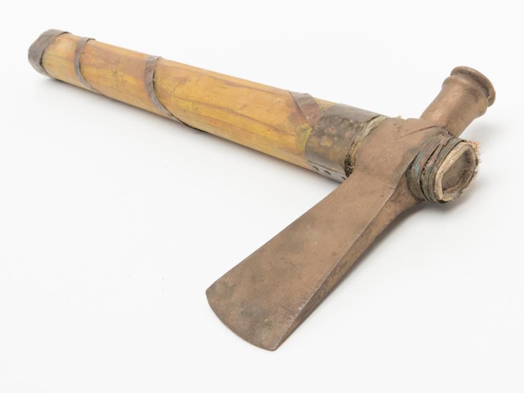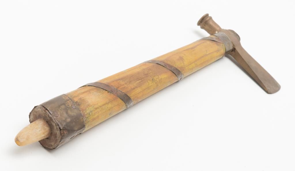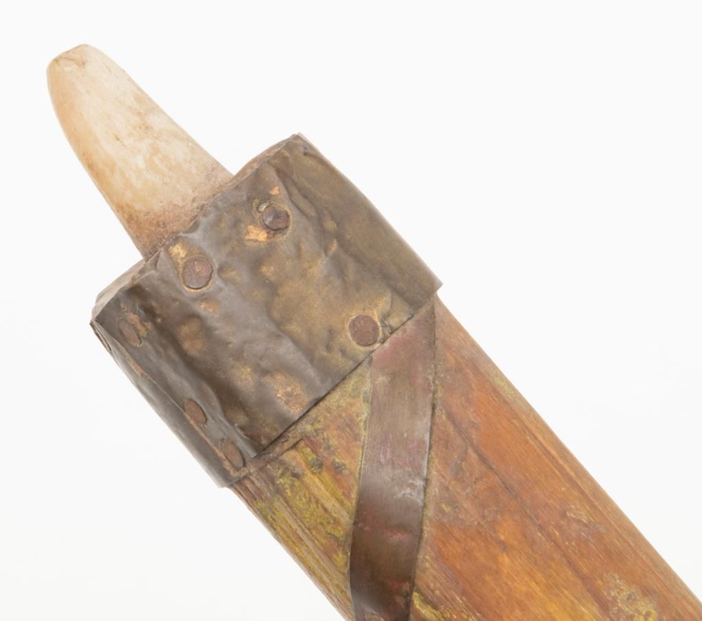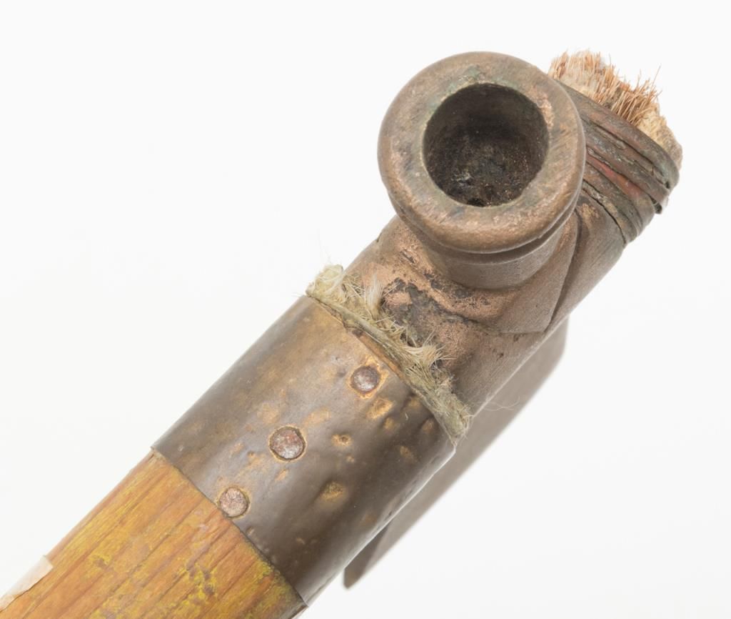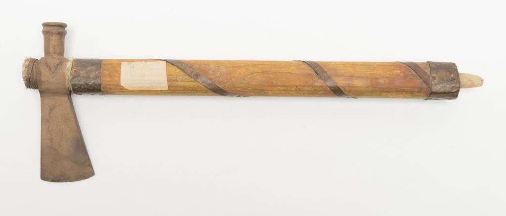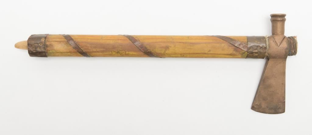 “Iron Eyes” Cody Peace Pipe, from the Roy Rogers & Dale Evans Museum, approx. 7” long with a 19-1/2” wood shaft, purchased by our consignor at a benefit auction at the Museum with documentation. “Iron Eyes” Cody was a well-known Hollywood actor and friend of Roy and Dale. He was an activist for the Native American community as well as a spokesman for protecting the great outdoors of America. Est.: $200-$400.